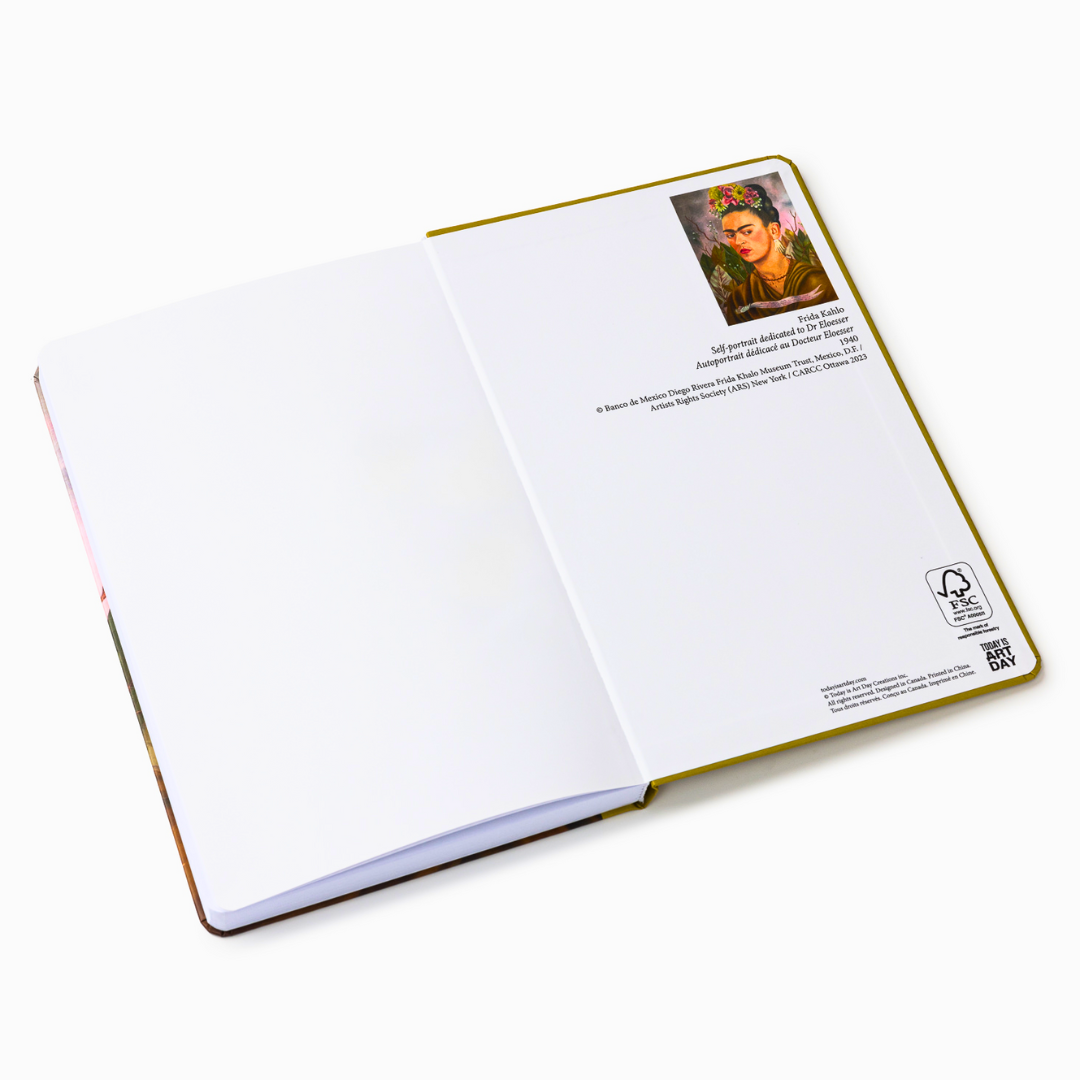Embrace the bold and vibrant spirit of Frida Kahlo with this inspiring journal from our Women in Art Collection. Featuring lined sheets and an elastic band closure, it's perfect for capturing your thoughts, sketches, or personal reflections. Explore Kahlo's life and art through the included artist description, offering a glimpse into her enduring legacy.