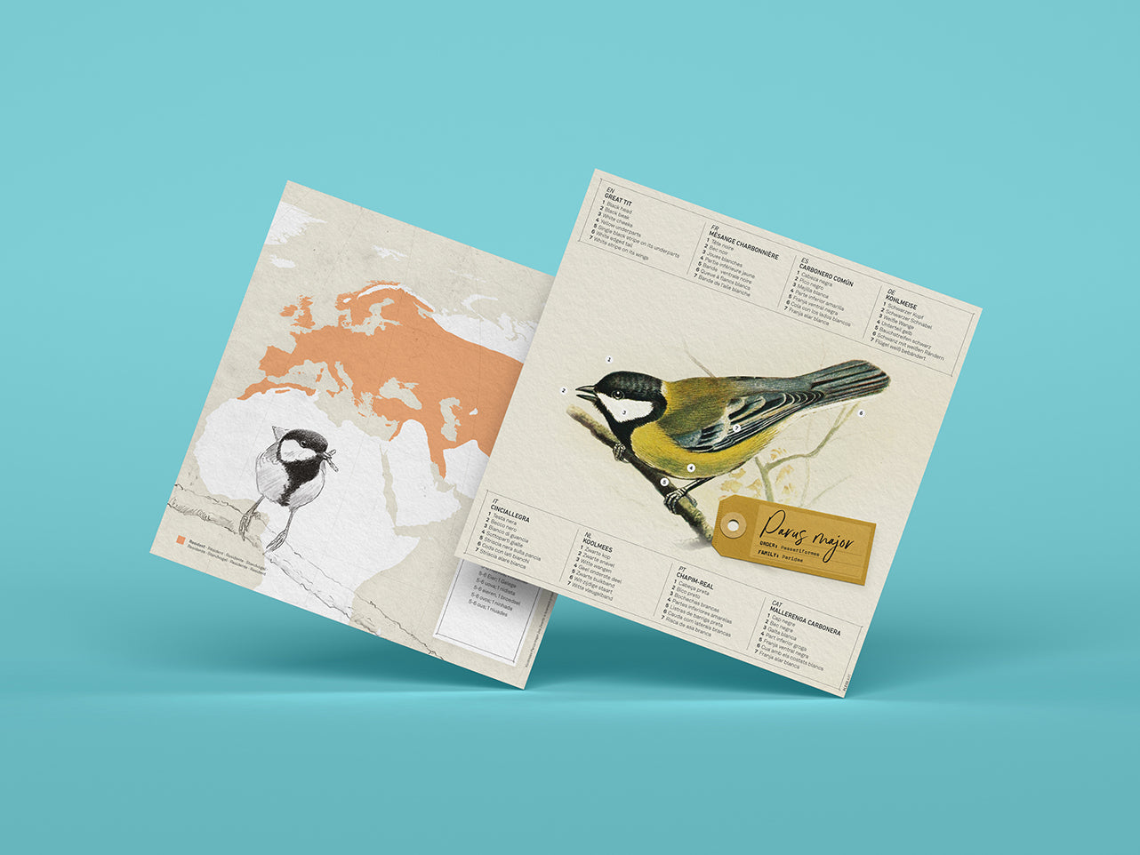 The kit includes 5 sheets of dyed-pulp art paper, made of 50% cotton and light resistant, a fact file with the great tit’s main characteristics, and instructions for assembly, all in 8 different languages. The parts come pre-cut with marked folds to make folding and assembly easier. All these materials are packaged in an attractive and durable envelope folder. White craft glue is needed to glue the parts of the model.